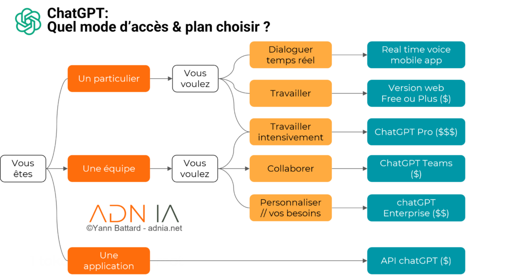 ADN IA a conçu ce schéma pour illustrer la réalité à laquelle font face utilisateurs individuels et entreprises : ChatGPT n’est pas une solution unique, mais un ensemble d’offres répondant à des besoins distincts.